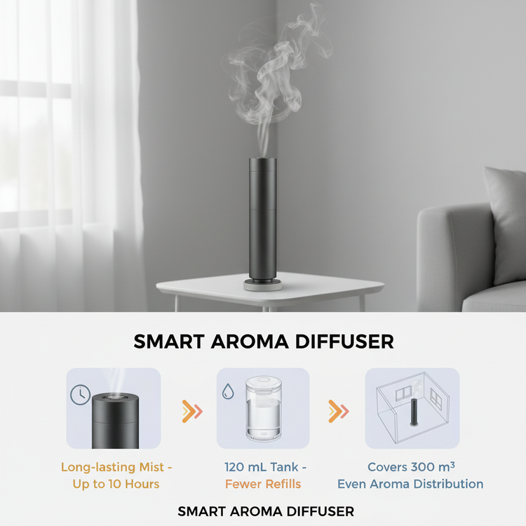 Enjoy hours of continuous or intermittent mist without frequent refills. The spacious 120 mL tank ensures your favorite essential oils diffuse evenly, keeping your environment fresh and inviting. Perfect for large rooms, this diffuser effortlessly covers up to 300 m³, creating a consistent scent experience from your living room to your workspace.