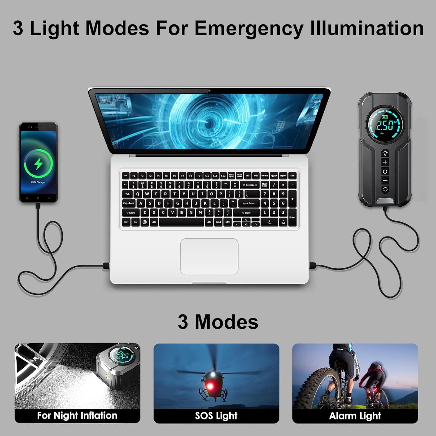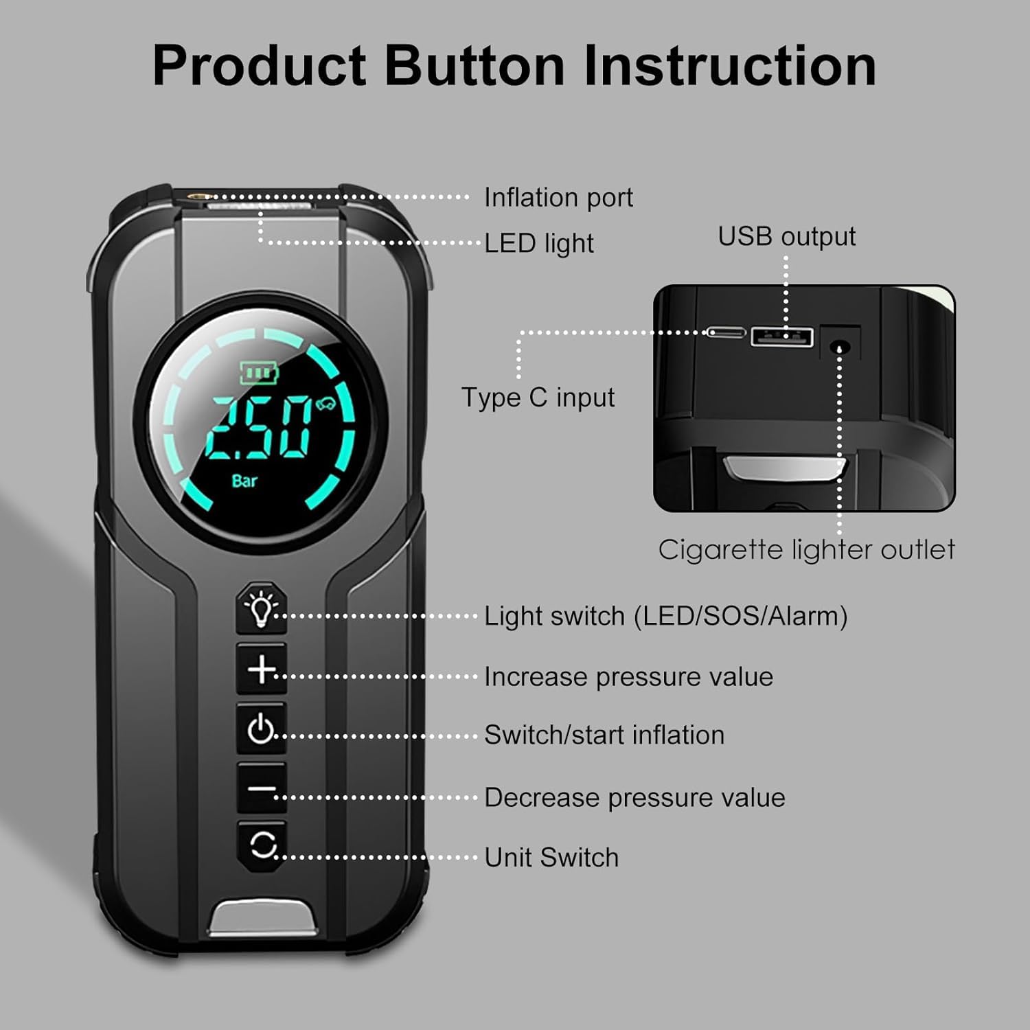 The digital LCD displays real-time pressure in PSI, BAR, KPA, or KG/CM², so you know exactly when you’ve reached the perfect level. Set your target pressure and let the auto shut-off feature prevent over-inflation every time. Compact and drop-resistant, this pump is ready for anything—right out of your glove box or backpack.