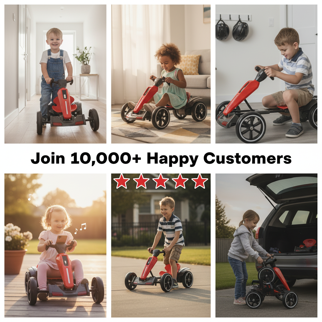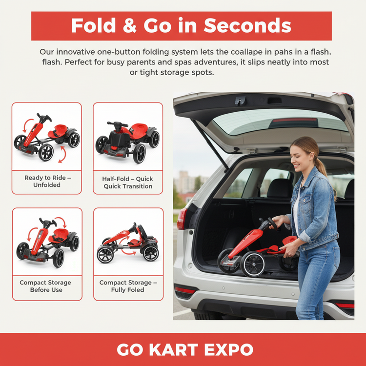 Our innovative one-button folding system lets you collapse the go-kart in a flash. Perfect for busy parents and spontaneous adventures, it slips neatly into most car trunks or tight storage spots.