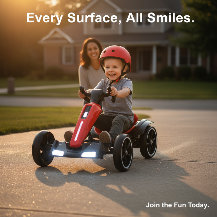 Equipped with EVA foam wheels, GO KART EXPO glides over driveways, sidewalks, and patios without a fuss. Plus, the front and rear LED lights keep every ride visible and secure. Your young driver will enjoy seamless performance across a variety of surfaces, while you enjoy peace of mind knowing theyβre well-lit and stable at every turn.
