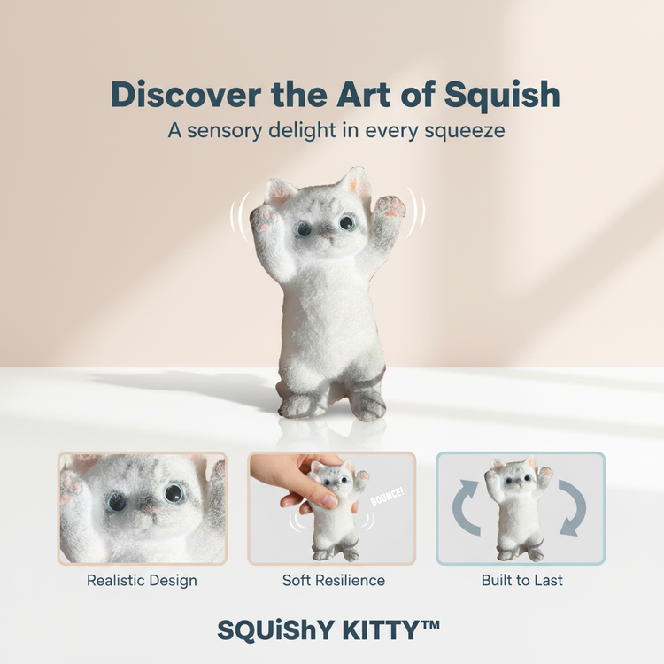 Crafted with meticulous detail, SQUiShY KITTY™ features painted stripes and a fur-like texture that looks just like a real tabby cat. Its weighted body and adorable facial features make it a charming companion on any desk. Each squeeze reveals its soft yet resilient TPR build, providing a sensory delight that keeps your hands busy and your mind at ease. It’s more than a toy—it’s a miniature work of art you can squish.